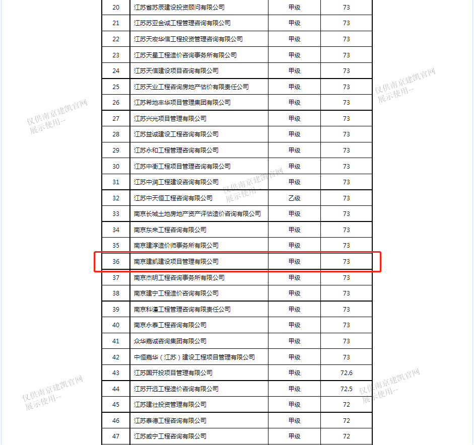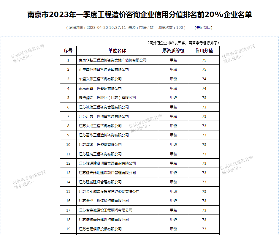 恭喜我司入选“南京市2023年一季度工程造价咨询企业信用分值排名前20%企业名单”