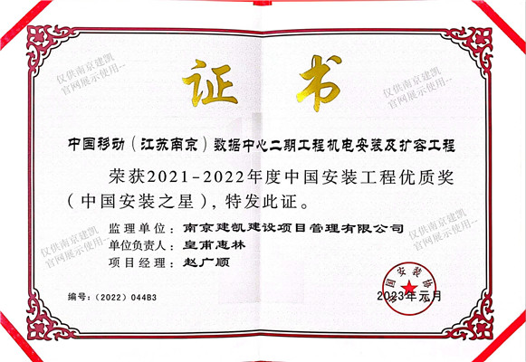 热烈祝贺我司中国移动(江苏南京)数据中心二期工程机电安装及扩容工程监理部荣获“2021-2022年度中国安装工程优质奖”