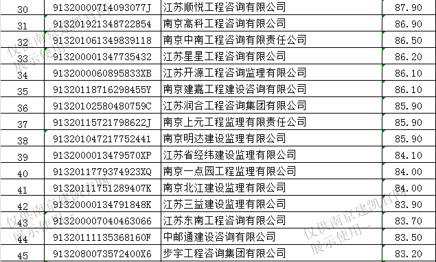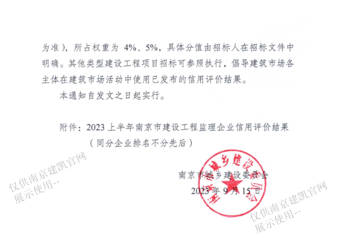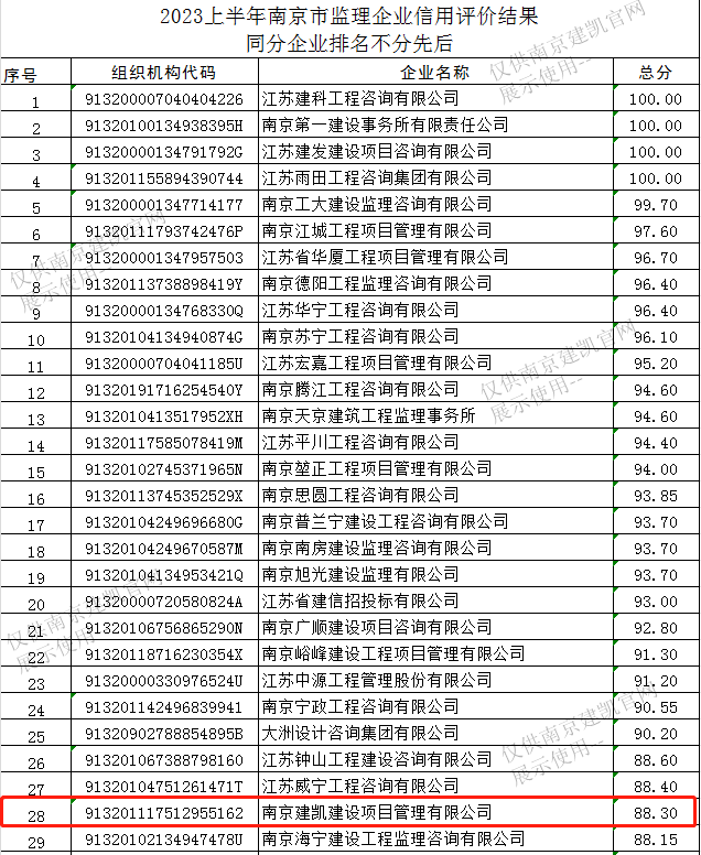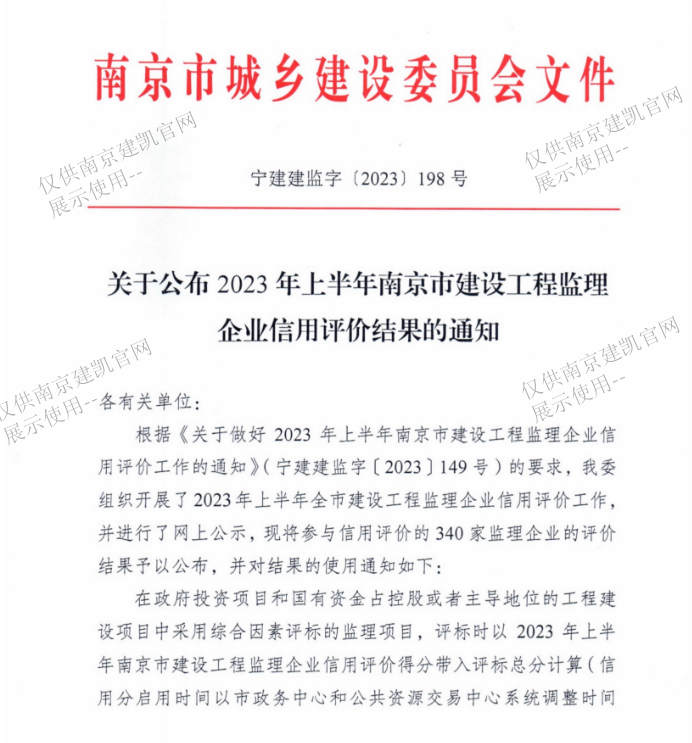 我司监理企业在2023年上半年南京市建设工程监理企业信用评价综合得分88.30分