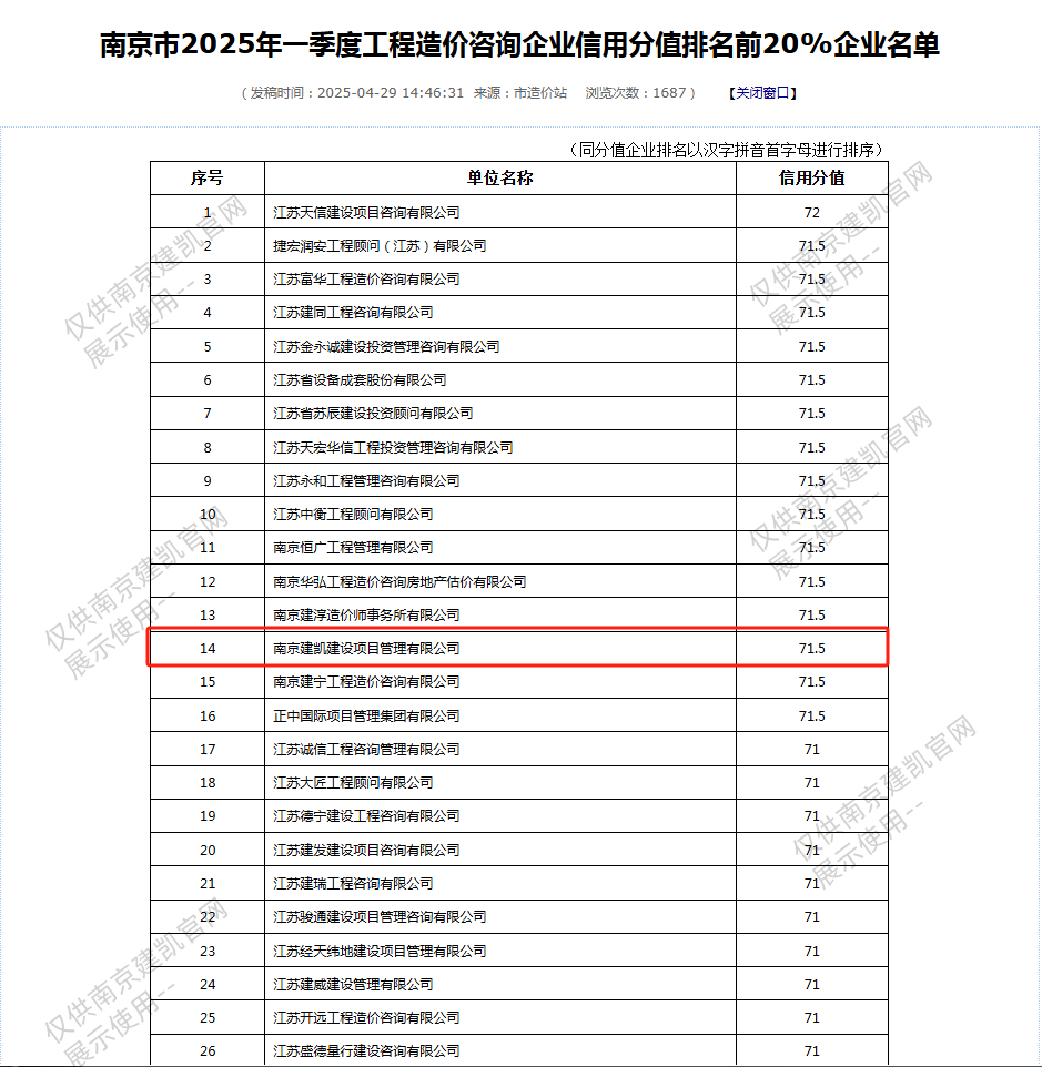 恭喜我司入选“南京市2025年一季度工程造价咨询企业信用分值排名前20%企业名单”