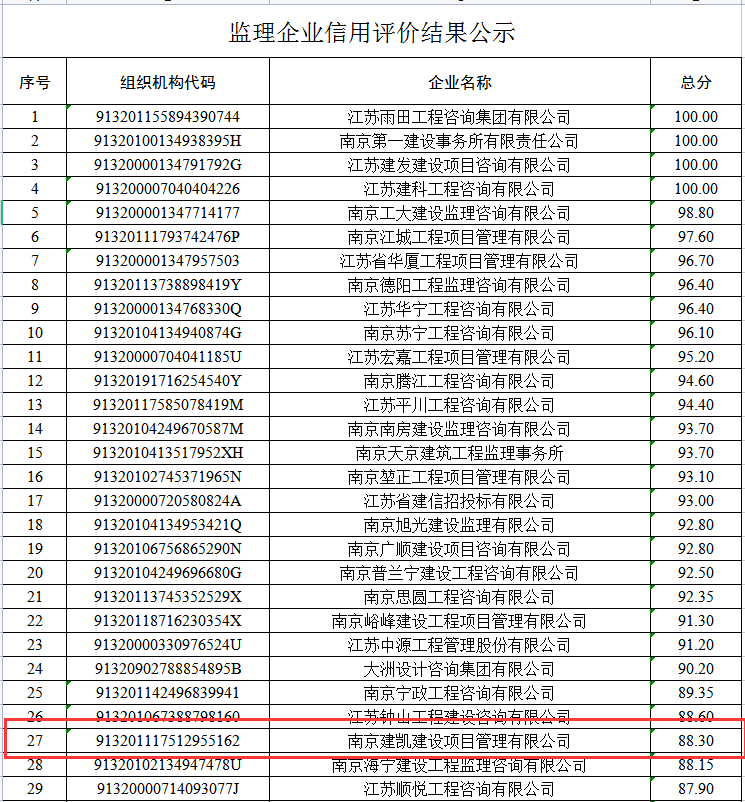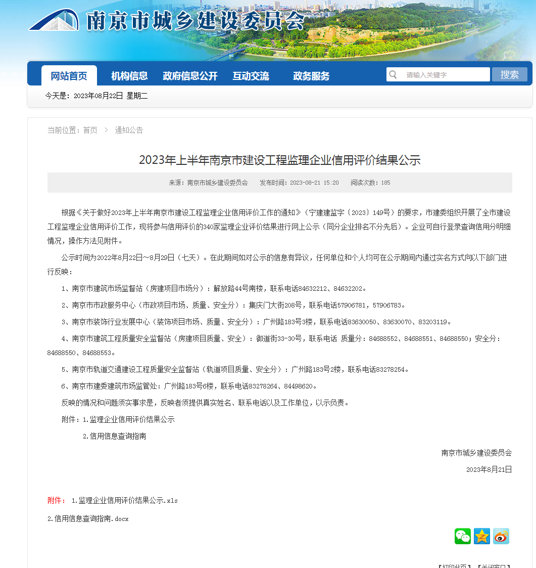 (2023年8月21日)市建委《2023年上半年南京市建设工程监理企业信用评价结果公示》