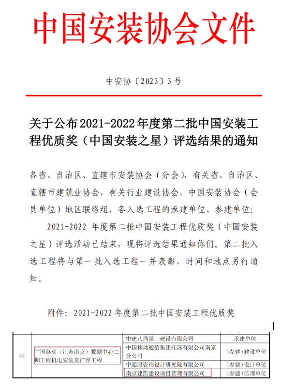 中国移动(江苏南京)数据中心二期工程机电安装及扩容工程荣获“中国安装工程优质奖(中国安装之星)”奖