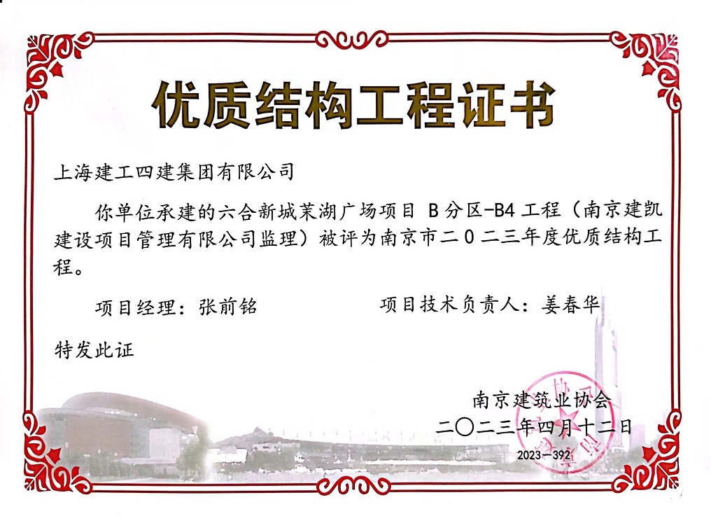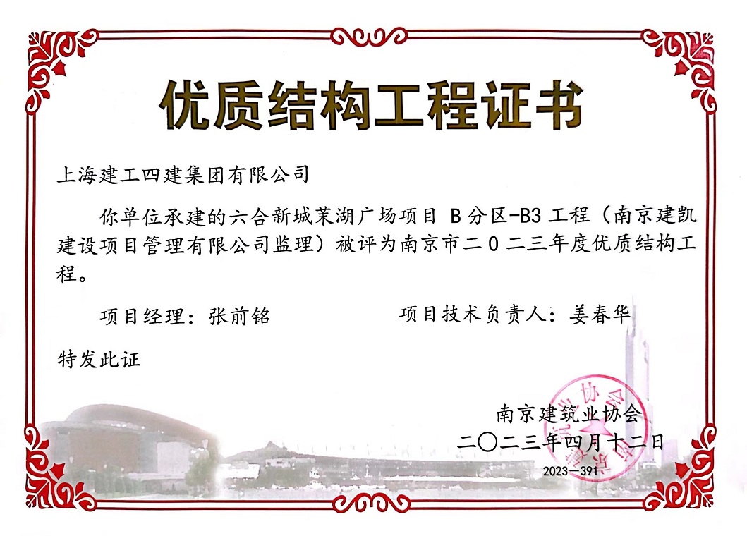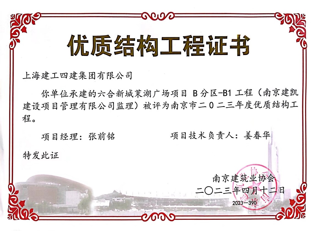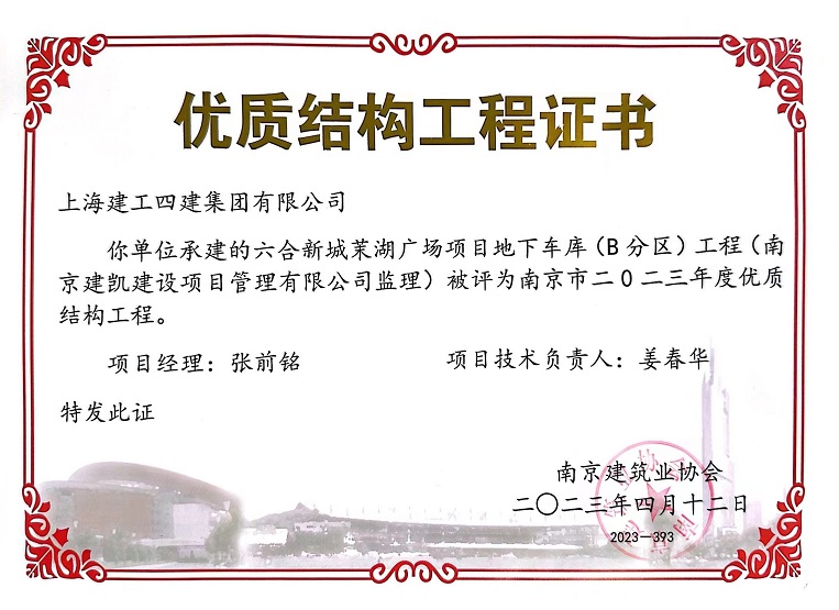 六合新城茉湖广场项目荣获“2023年度优质结构工程”