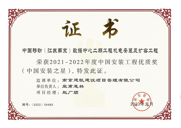中国移动(江苏南京)数据中心二期工程机电安装及扩容工程荣获“中国安装工程优质奖(中国安装之星)”奖