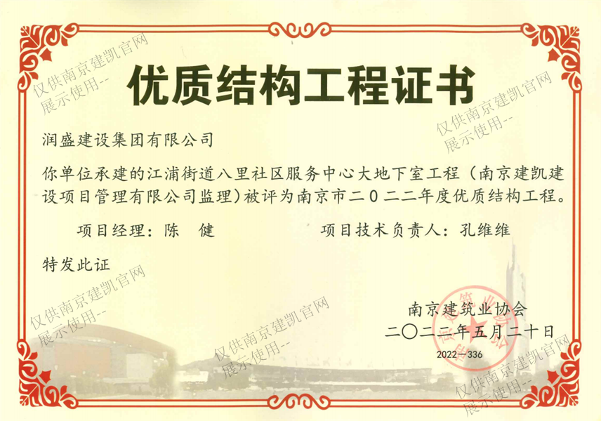 南京市二0二二年度优质结构工程(江浦街道八里社区服务中心大地下室工程)