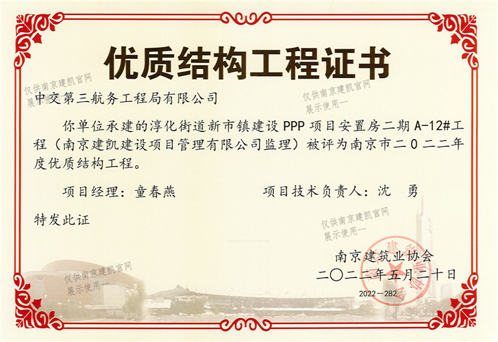 南京市二0二二年度优质结构工程(淳化街道新市镇建设PPP项目安置房二期A-12#工程)