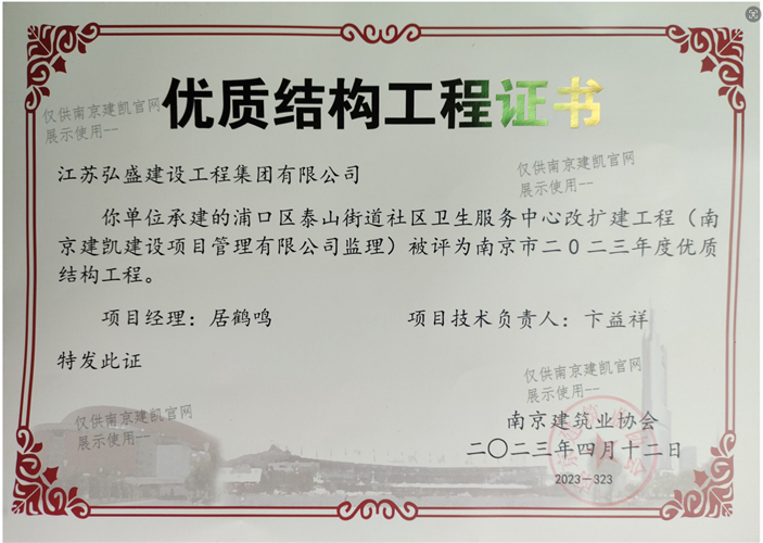 南京市二0二三年度优质结构工程(浦口区泰山街道社区卫生服务中心改扩建工程)