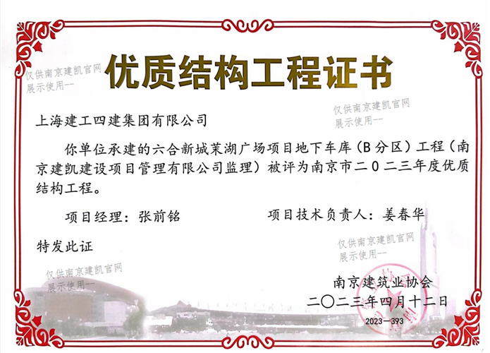 南京市二0二三年度优质结构工程(六合新城茉湖广场项目地下车库工程)